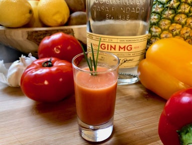 - Neem enkele serveerglaasjes en giet er eerst 5 ml gin in. Voeg daarna de gazpacho toe.