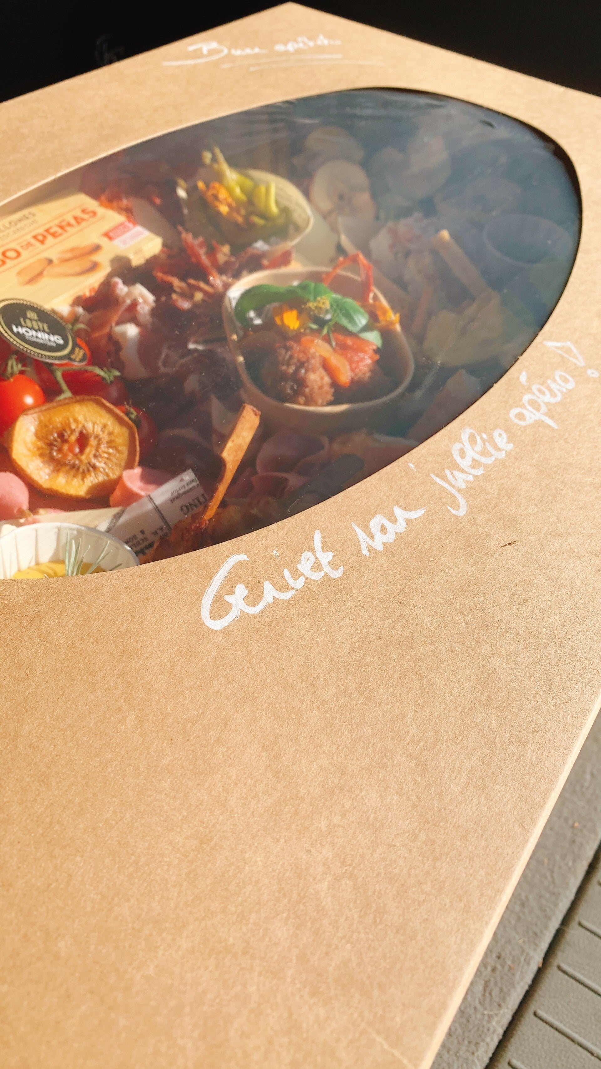 Tapas-Box is voorzien van: Jamón Serrano Gran Reserva, Dried Jamón Serrano, Chorizo Extra Picante, Fuet Casa Tarradellas, Lomo Iberico Bellota , Mortadella, Manchego, Iberico-Kaas, Olijven, Zongedroogde Tomaatjes, Jalapeño, Pepers Verde, Salsa, Tapenade, Pesto, Aioli, Zuurdesembrood, HomeMade Garlic Nacho's, Pan Con Aioli, Kerstomaatjes, Mejillones/Sardinas, ...