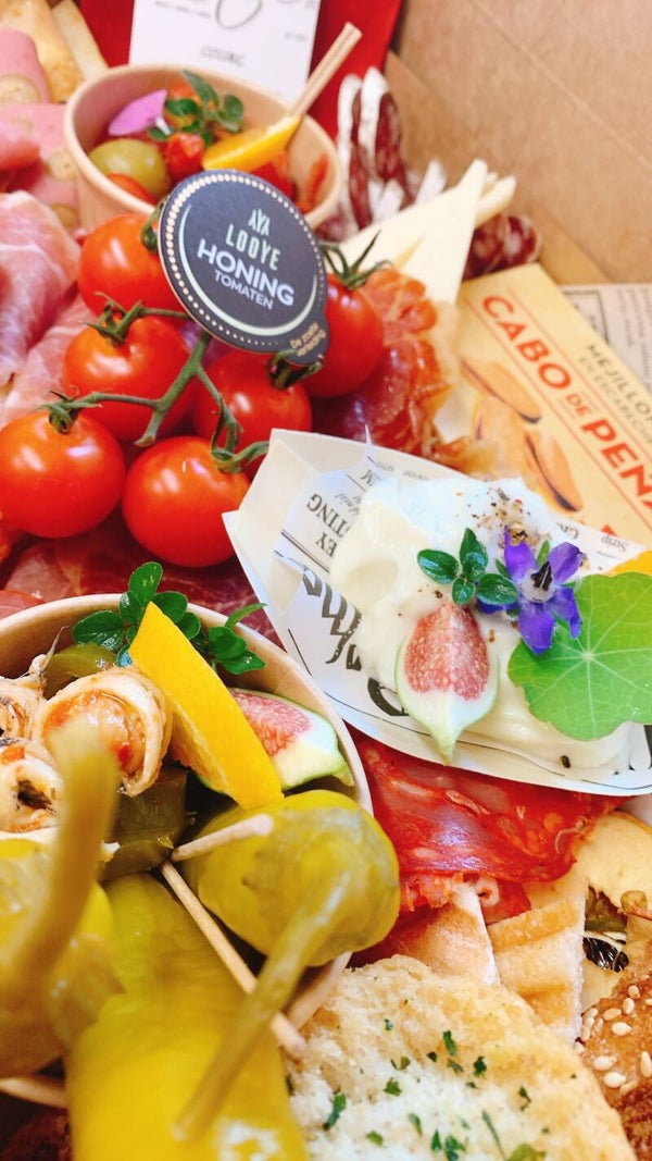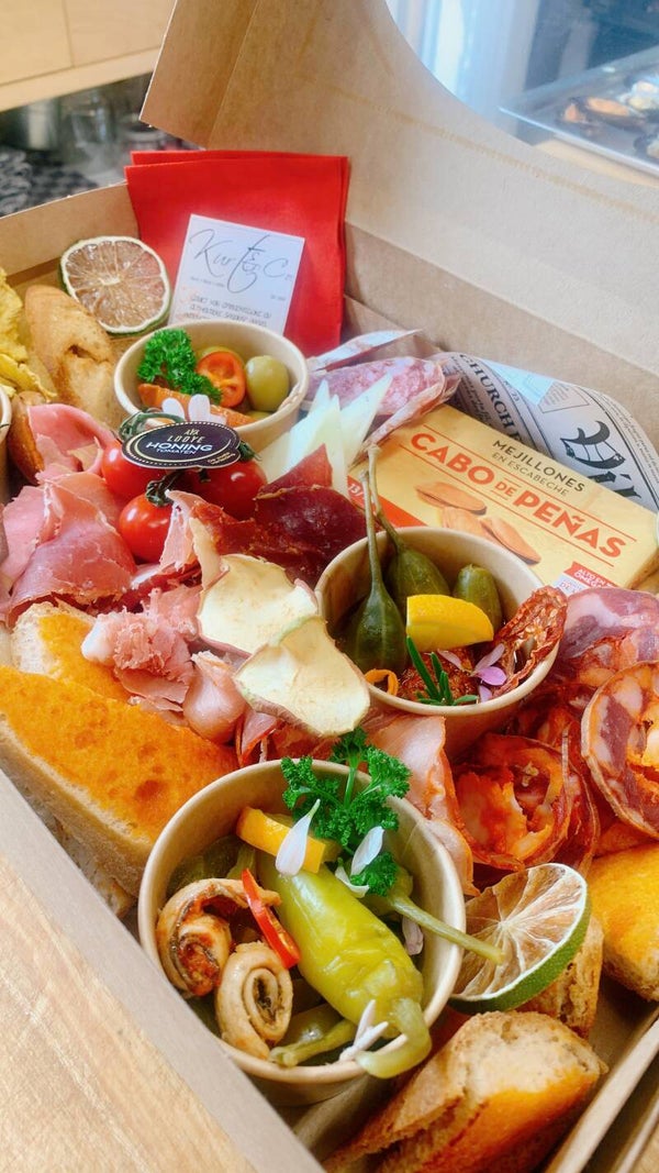 Ondertussen hebben we deze wat aangepast tot een ideale Apéro-Box waarvan je met twee personen gezellig kan apertieven. Of je kan het alleen bestellen, dan heb je zeker genoeg voor een volledige maaltijd. Al voorzie ik altijd wel wat extra hoor, op zo’n momenten waarop je net zo’n tapasbox wil openen, kom er toch altijd iemand binnen die graag een paar stukjes mee proeft”.